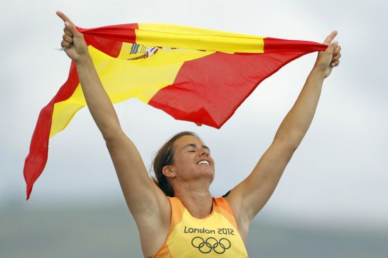 Picture source: Spain's Marina Alabau celebrates after crossing the finish line to win the women's RS-X sailing class during the medal race in Weymouth. / BENOIT TESSIER (REUTERS)